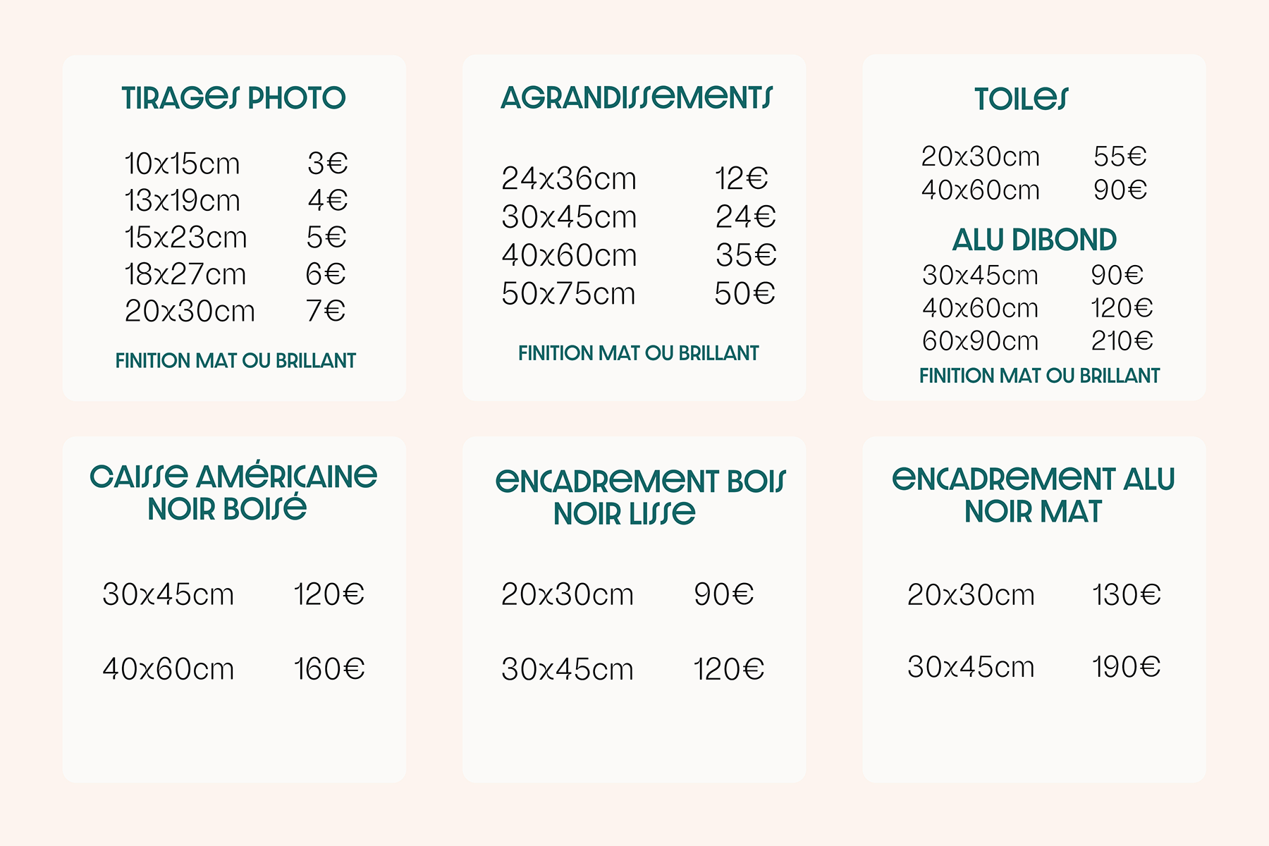 Du tirage photo classique aux formats plus décoratifs, plusieurs finitions sont disponibles : impression sur toile, encadrement avec caisse américaine, cadres en bois noir ou en aluminium Dibond. Chaque support est choisi pour son rendu esthétique, sa durabilité et la qualité de ses matériaux.